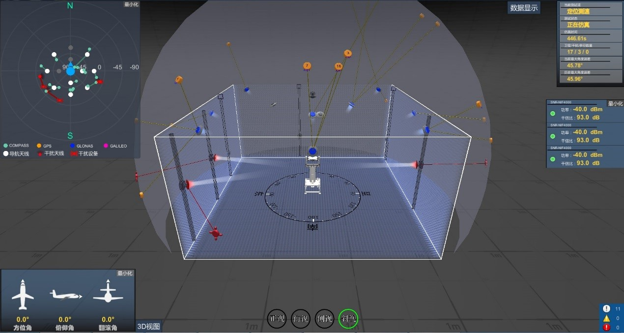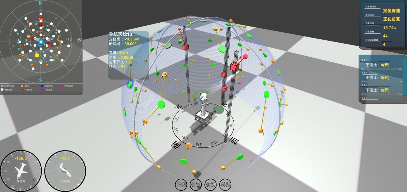 卫星导航复杂电磁环境模拟实验室通过构建无线测试环境来模拟开放环境中可见星座导航信号及可能面临的多种复杂干扰,模拟干扰信号与卫星信号之间夹角三维、动态连续变化,以便较全面测试导航终端的动、静态性能及复杂电磁环境下的抗干扰性能。整个系统需要模拟以北斗为主的多种导航信号布局、相关频段的干扰信号布局,以及被测设备状态控制,最终完成对被测设备的动、静态性能和抗干扰能力的定量测试和评估,给出测试及评估报告。另外,该系统还能模拟真实环境下的遮挡效应、多径效应,将暗室内测试与真实环境建模仿真结合在一起,更逼真地模拟真实环境。